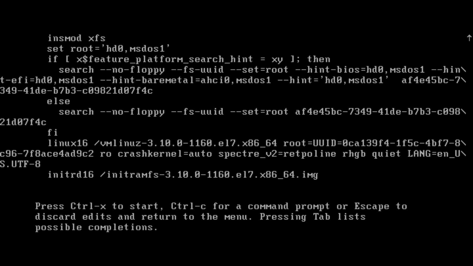 3 . 텍스트 편집창 맨 하단 linux16 .... root = 으로 시작하는 라인 맨 끝에 init=/bin/sh 을 추가하고 CTRL + X를 눌러 CRUB를 시작합니다.